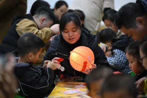 在手工灯笼区,孩子们围坐在一起,志愿者们手把手地帮助孩子们固定灯笼骨架、粘贴装饰,一步步将零散的材料变成一个个喜庆的红灯笼。